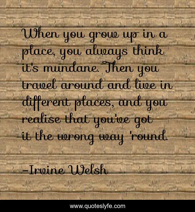 This page presents the quote "When you grow up in a place, you always think it's mundane. Then you travel around and live in different places, and you realise that you've got it the wrong way 'round.". Author of this quote is Irvine Welsh. This quote is about live, grow, think,.