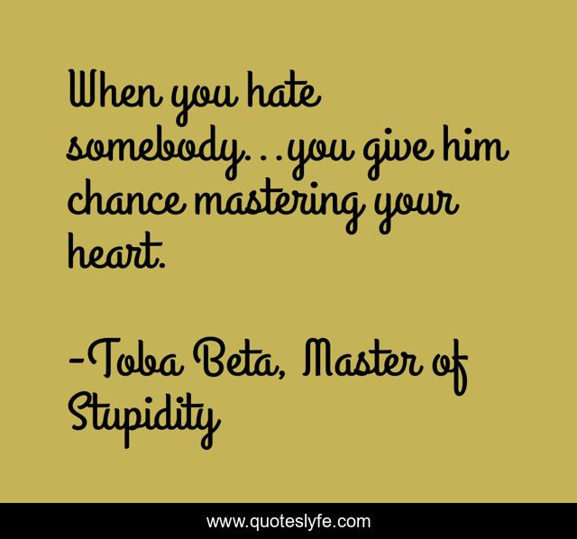 This page presents the quote "When you hate somebody...you give him chance mastering your heart.". Author of this quote is Toba Beta, Master of Stupidity. This quote is about heart, chance, hate, hatred, master,.