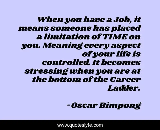 This page presents the quote "When you have a Job, it means someone has placed a limitation of TIME on you. Meaning every aspect of your life is controlled. It becomes stressing when you are at the bottom of the Career Ladder.". Author of this quote is Oscar Bimpong. This quote is about controlled-life, career-ladder, job, limitation-of-time, stressing,.
