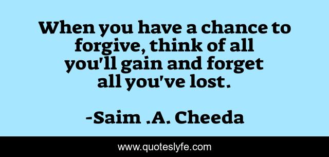This page presents the quote "When you have a chance to forgive, think of all you'll gain and forget all you've lost.". Author of this quote is Saim .A. Cheeda. This quote is about right, move-on, forget, lost, forgiveness, chance, gain, apology, opportunity,.