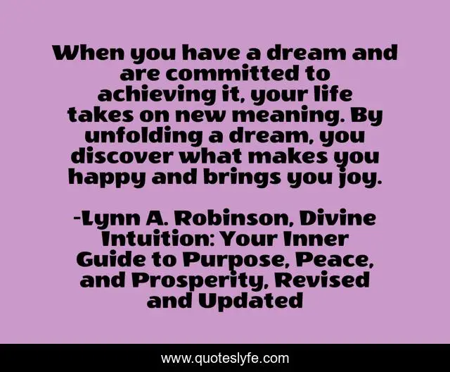This page presents the quote "When you have a dream and are committed to achieving it, your life takes on new meaning. By unfolding a dream, you discover what makes you happy and brings you joy.". Author of this quote is Lynn A. Robinson, Divine Intuition: Your Inner Guide to Purpose, Peace, and Prosperity, Revised and Updated. This quote is about abundance, spirituality, intuition, divine-intuition, manifestation,.