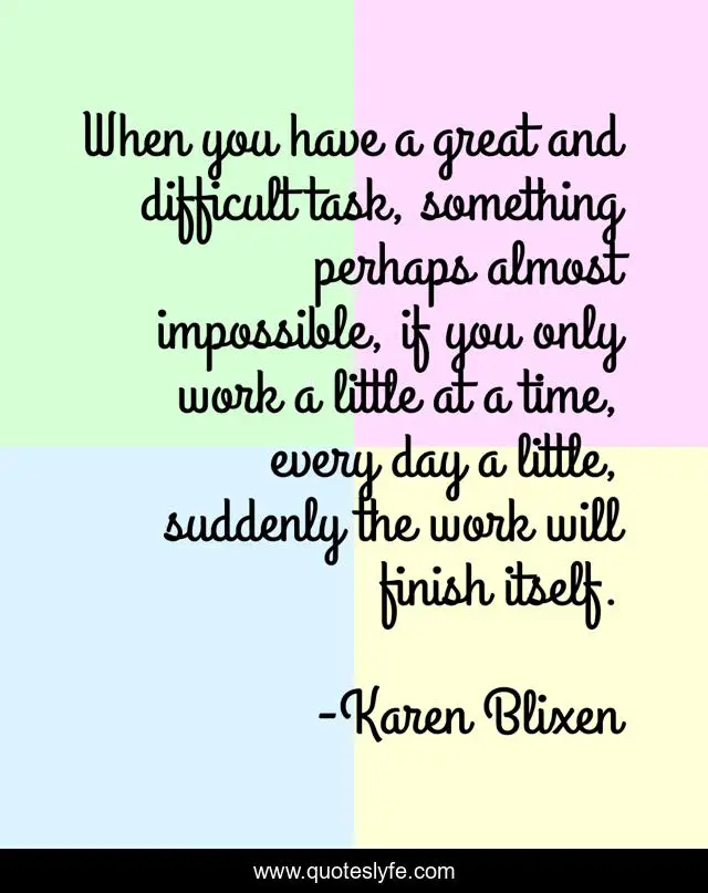 This page presents the quote "When you have a great and difficult task, something perhaps almost impossible, if you only work a little at a time, every day a little, suddenly the work will finish itself.". Author of this quote is Karen Blixen. This quote is about perseverance, hope, inspirational, enthusiasm,.