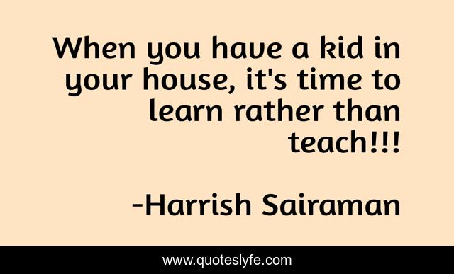 This page presents the quote "When you have a kid in your house, it's time to learn rather than teach!!!". Author of this quote is Harrish Sairaman. This quote is about enthusiasm, life, teach, inspirational, kid,.