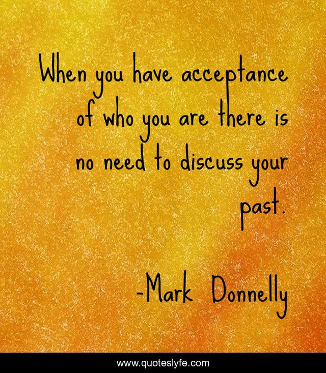 This page presents the quote "When you have acceptance of who you are there is no need to discuss your past.". Author of this quote is Mark Donnelly. This quote is about acceptance, life-s-lessons, truth,.