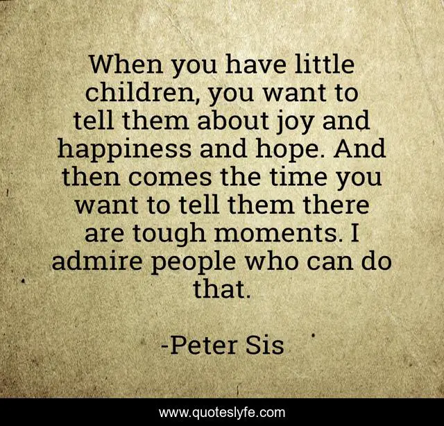 This page presents the quote "When you have little children, you want to tell them about joy and happiness and hope. And then comes the time you want to tell them there are tough moments. I admire people who can do that.". Author of this quote is Peter Sis. This quote is about children, happiness, time,.