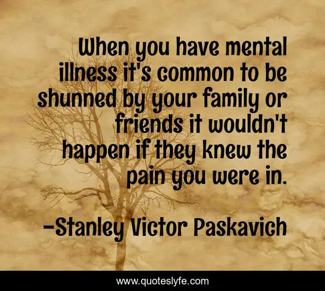 This page presents the quote "When you have mental illness it's common to be shunned by your family or friends it wouldn't happen if they knew the pain you were in.". Author of this quote is Stanley Victor Paskavich. This quote is about pain, psychology, bipolar, stantasyland, suffering, trauma, mental-illness, ptsd, depression,.