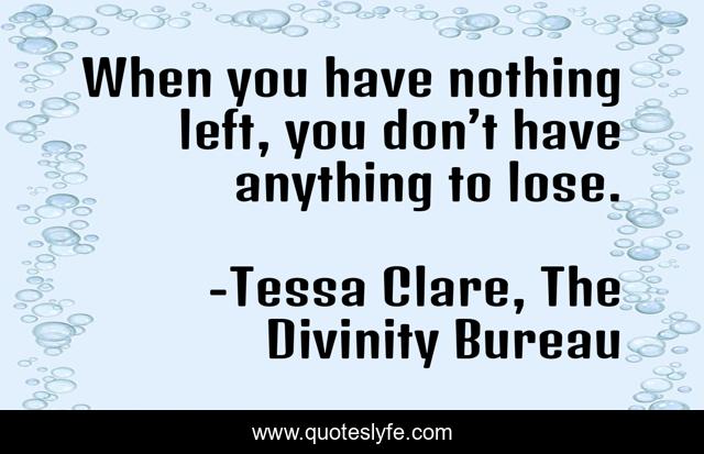 This page presents the quote "When you have nothing left, you don’t have anything to lose.". Author of this quote is Tessa Clare, The Divinity Bureau. This quote is about strength, loss-of-innocence, courage, inspirational, enthusiasm, resilience,.