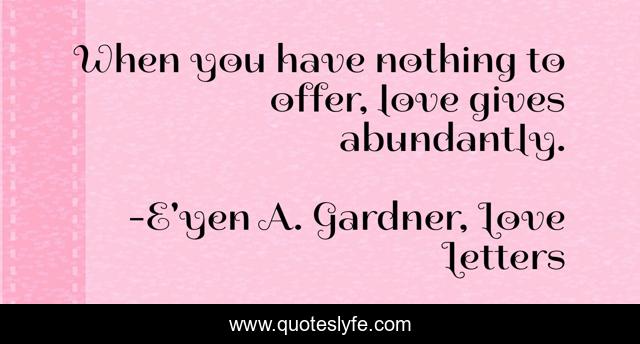 This page presents the quote "When you have nothing to offer, love gives abundantly.". Author of this quote is E'yen A. Gardner, Love Letters. This quote is about love, grace-of-god, love-letters, grace, affection,.
