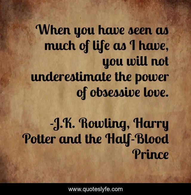 This page presents the quote "When you have seen as much of life as I have, you will not underestimate the power of obsessive love.". Author of this quote is J.K. Rowling, Harry Potter and the Half-Blood Prince. This quote is about love, obsession, infatuation, affection, love-struck,.