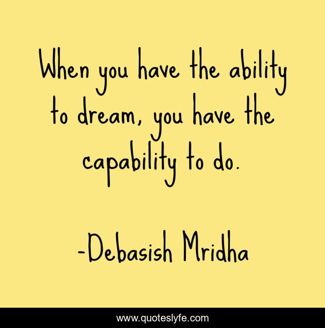 This page presents the quote "When you have the ability to dream, you have the capability to do.". Author of this quote is Debasish Mridha. This quote is about life, love, knowledge, inspirational, intelligence, philosophy, wisdom, quotes, affection,.