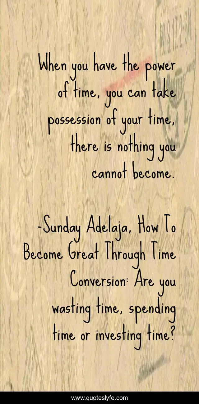 "Sunday Adelaja, How To Become Great Through Time Conversion: Are you wasting time, spending time or investing time? Quotes." Quoteslyfe.com, 2025. Fri. 05 Dec. 2025. <https://www.quoteslyfe.com/quote/When-you-have-the-power-of-time-39021>.