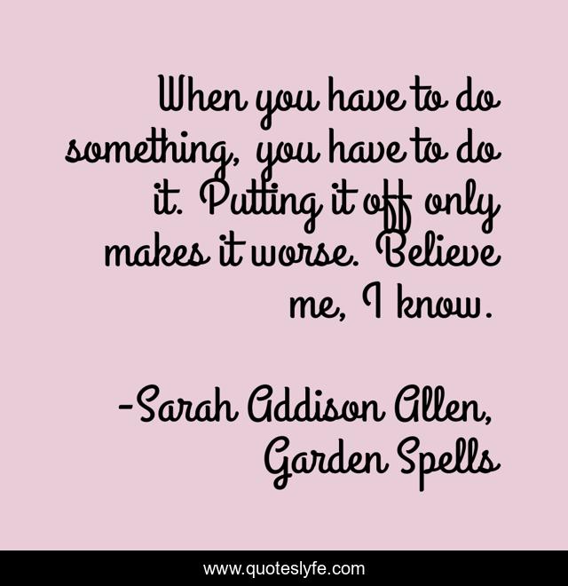 This page presents the quote "When you have to do something, you have to do it. Putting it off only makes it worse. Believe me, I know.". Author of this quote is Sarah Addison Allen, Garden Spells. This quote is about life-lesson, life,.