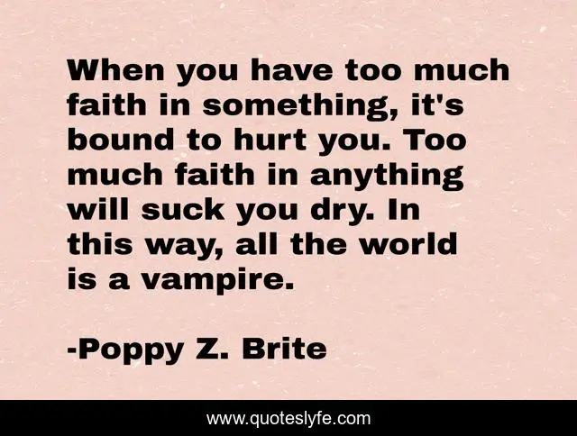 This page presents the quote "When you have too much faith in something, it's bound to hurt you. Too much faith in anything will suck you dry. In this way, all the world is a vampire.". Author of this quote is Poppy Z. Brite. This quote is about horror, vampire,.
