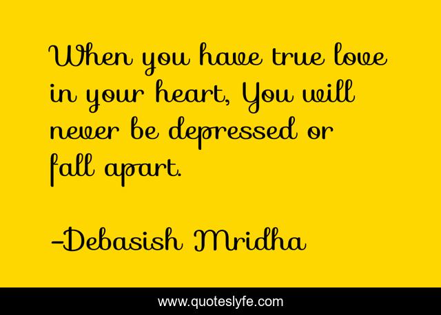 This page presents the quote "When you have true love in your heart, You will never be depressed or fall apart.". Author of this quote is Debasish Mridha. This quote is about heart, life, debasish, love, depressed, mridha, philosophy, affection,.