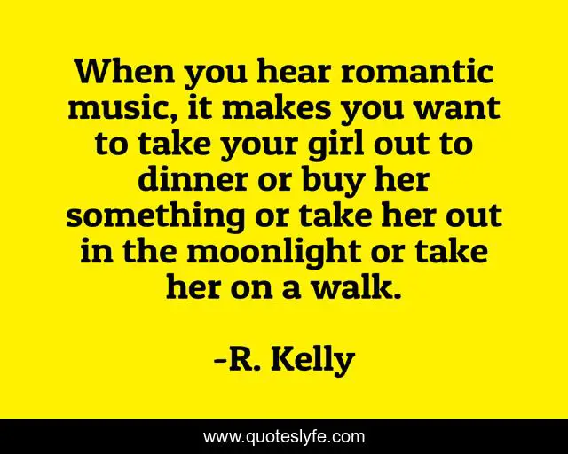 This page presents the quote "When you hear romantic music, it makes you want to take your girl out to dinner or buy her something or take her out in the moonlight or take her on a walk.". Author of this quote is R. Kelly. This quote is about girl, music, walk,.
