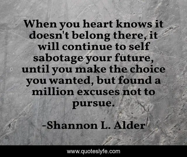 This page presents the quote "When you heart knows it doesn't belong there, it will continue to self sabotage your future, until you make the choice you wanted, but found a million excuses not to pursue.". Author of this quote is Shannon L. Alder. This quote is about love, pursue, choices, being-selective, decisions, givibg-up, affection,.