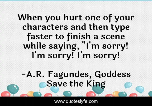 This page presents the quote "When you hurt one of your characters and then type faster to finish a scene while saying, "I'm sorry! I'm sorry! I'm sorry!". Author of this quote is A.R. Fagundes, Goddess Save the King. This quote is about writing-process, character-building, writing,.