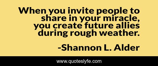 This page presents the quote "When you invite people to share in your miracle, you create future allies during rough weather.". Author of this quote is Shannon L. Alder. This quote is about relationships, strangers, kids, allies, family, collaboration, connections, church-members, ensuring-the-future,.