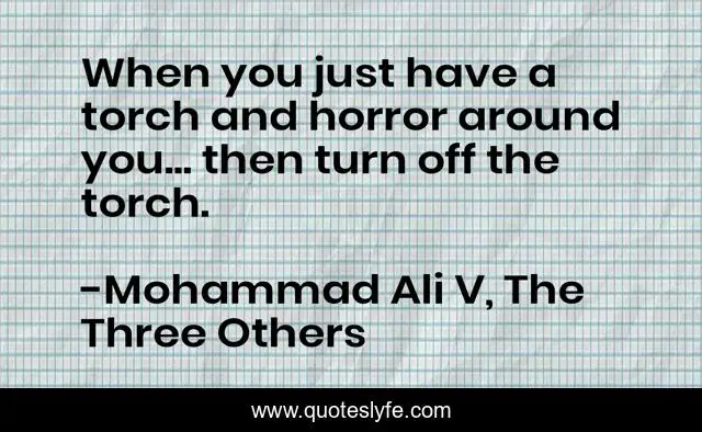 This page presents the quote "When you just have a torch and horror around you... then turn off the torch.". Author of this quote is Mohammad Ali V, The Three Others. This quote is about horror, mystery-suspense, psychology, thriller,.