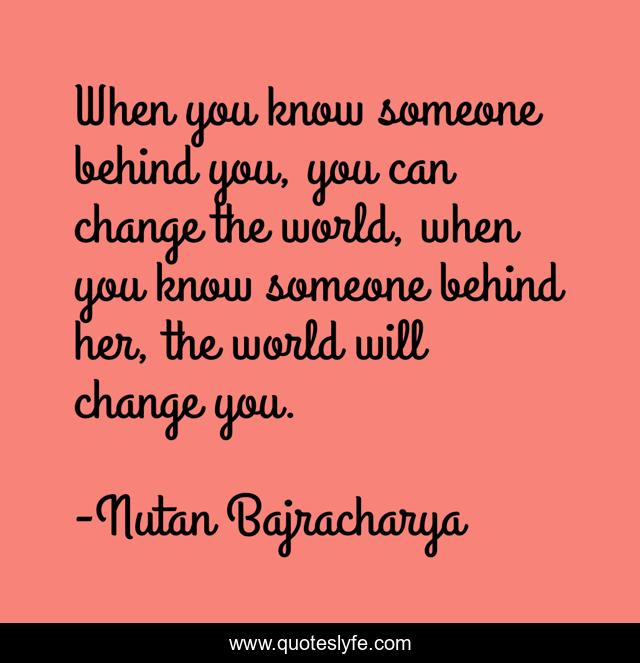 This page presents the quote "When you know someone behind you, you can change the world, when you know someone behind her, the world will change you.". Author of this quote is Nutan Bajracharya. This quote is about emotion, life, love, remember, change, she, affection,.