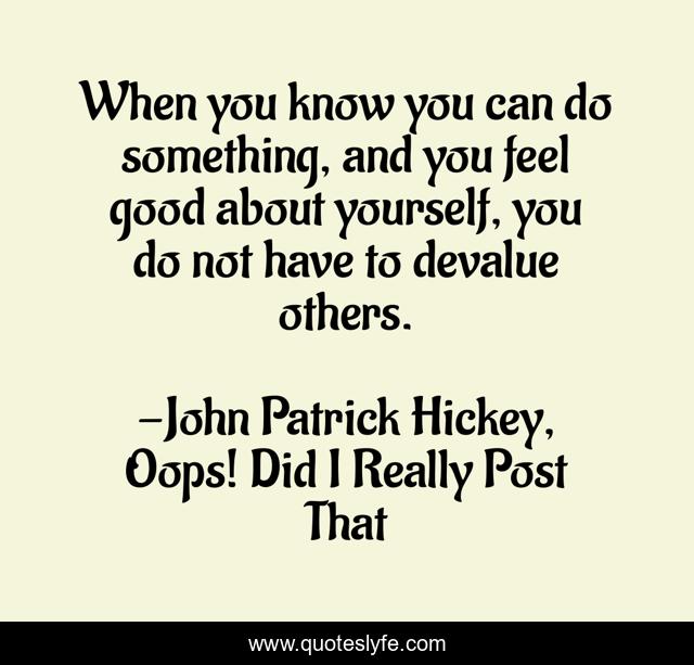 This page presents the quote "When you know you can do something, and you feel good about yourself, you do not have to devalue others.". Author of this quote is John Patrick Hickey, Oops! Did I Really Post That. This quote is about etiquette, social-media, success, civility, manners, personal-development, kindness,.