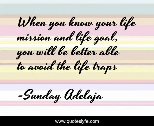 This page presents the quote "When you know your life mission and life goal, you will be better able to avoid the life traps". Author of this quote is Sunday Adelaja. This quote is about life, goal, mission, calling, purpose, life-mission, failures, traps,.