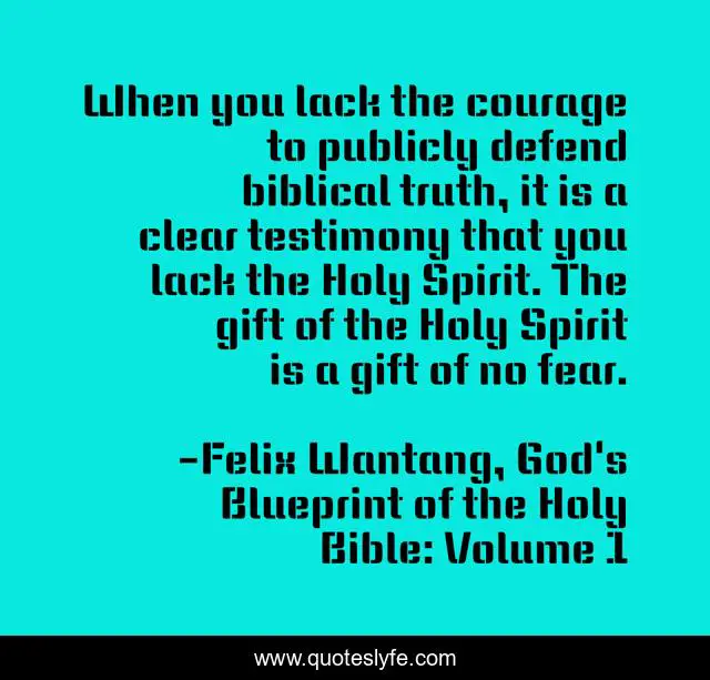 This page presents the quote "When you lack the courage to publicly defend biblical truth, it is a clear testimony that you lack the Holy Spirit. The gift of the Holy Spirit is a gift of no fear.". Author of this quote is Felix Wantang, God's Blueprint of the Holy Bible: Volume 1. This quote is about jesus-christ, bible, gift, defend, courage, testimony, holy-spirit,.