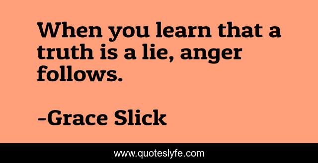This page presents the quote "When you learn that a truth is a lie, anger follows.". Author of this quote is Grace Slick. This quote is about lie, truth is, truth,.