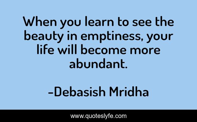 This page presents the quote "When you learn to see the beauty in emptiness, your life will become more abundant.". Author of this quote is Debasish Mridha. This quote is about philosophy, beauty, mridha, more-abundant, debasish, debasish-mridha, emptiness,.