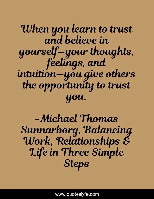 This page presents the quote "When you learn to trust and believe in yourself—your thoughts, feelings, and intuition—you give others the opportunity to trust you.". Author of this quote is Michael Thomas Sunnarborg, Balancing Work, Relationships & Life in Three Simple Steps. This quote is about relationships, intuition, trust, belief,.