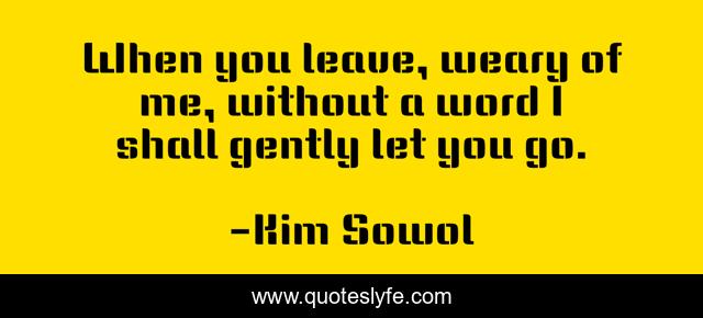 This page presents the quote "When you leave, weary of me, without a word I shall gently let you go.". Author of this quote is Kim Sowol. This quote is about heartache, love, letting-go, korean-poetry, heartbreak, azaleas, affection,.