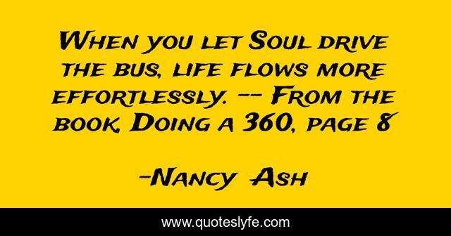 This page presents the quote "When you let Soul drive the bus, life flows more effortlessly. -- From the book, Doing a 360, page 8". Author of this quote is Nancy Ash. This quote is about spiritual, soul, spirit,.