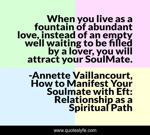 This page presents the quote "When you live as a fountain of abundant love, instead of an empty well waiting to be filled by a lover, you will attract your SoulMate.". Author of this quote is Annette Vaillancourt, How to Manifest Your Soulmate with Eft: Relationship as a Spiritual Path. This quote is about attract-your-soulmate, soulmate, love, soulmates, affection,.