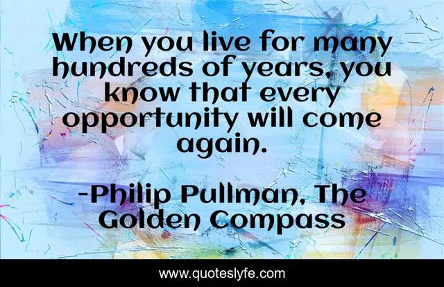 This page presents the quote "When you live for many hundreds of years, you know that every opportunity will come again.". Author of this quote is Philip Pullman, The Golden Compass. This quote is about life, opportunities,.