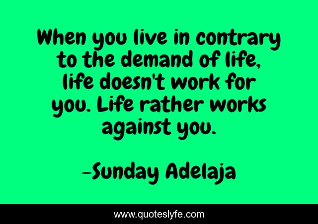 This page presents the quote "When you live in contrary to the demand of life, life doesn't work for you. Life rather works against you.". Author of this quote is Sunday Adelaja. This quote is about live, contrary, demand,.