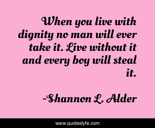 This page presents the quote "When you live with dignity no man will ever take it. Live without it and every boy will steal it.". Author of this quote is Shannon L. Alder. This quote is about relationships, dignity, honorable-men, self-respect, christlike, living, acceptance, seek-excellence, self-love,.