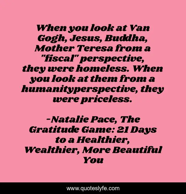 This page presents the quote "When you look at Van Gogh, Jesus, Buddha, Mother Teresa from a "fiscal" perspective, they were homeless. When you look at them from a humanityperspective, they were priceless.". Author of this quote is Natalie Pace, The Gratitude Game: 21 Days to a Healthier, Wealthier, More Beautiful You. This quote is about gratitude, prosperity, van-gogh, love, leaders, peace, jesus, religion, buddha,.