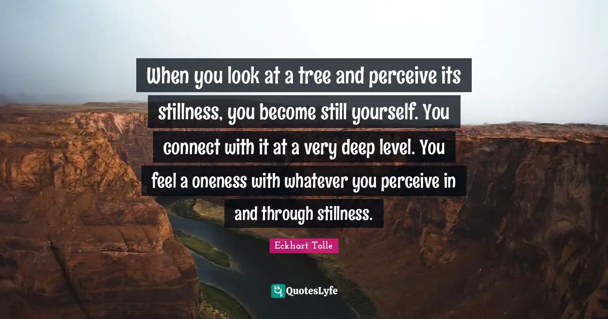 This page presents the quote "When you look at a tree and perceive its stillness, you become still yourself. You connect with it at a very deep level. You feel a oneness with whatever you perceive in and through stillness.". Author of this quote is Eckhart Tolle. This quote is about perceive, looks, very deep, oneness, stillness, tree,.