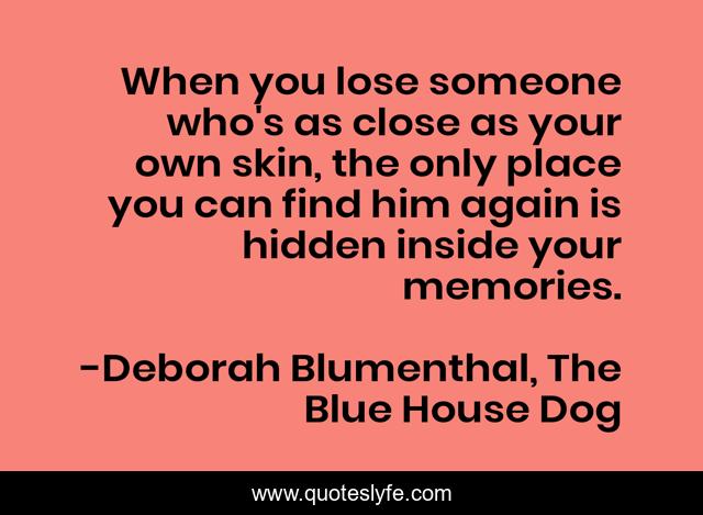 This page presents the quote "When you lose someone who's as close as your own skin, the only place you can find him again is hidden inside your memories.". Author of this quote is Deborah Blumenthal, The Blue House Dog. This quote is about loss, memories,.
