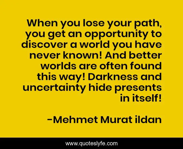 This page presents the quote "When you lose your path, you get an opportunity to discover a world you have never known! And better worlds are often found this way! Darkness and uncertainty hide presents in itself!". Author of this quote is Mehmet Murat ildan. This quote is about path-of-life, paths, turkish-aphorisms, darkness-and-light, darkness, ildan-wise-sayings, turkish, ildan-wisdom, losing-path,.