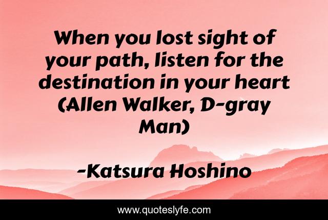 This page presents the quote "When you lost sight of your path, listen for the destination in your heart (Allen Walker, D-gray Man)". Author of this quote is Katsura Hoshino. This quote is about life, destination, purpose, inspirational, enthusiasm, manga,.