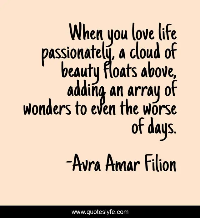 This page presents the quote "When you love life passionately, a cloud of beauty floats above, adding an array of wonders to even the worse of days.". Author of this quote is Avra Amar Filion. This quote is about good-days, joy, bad-days, passion, love-life,.