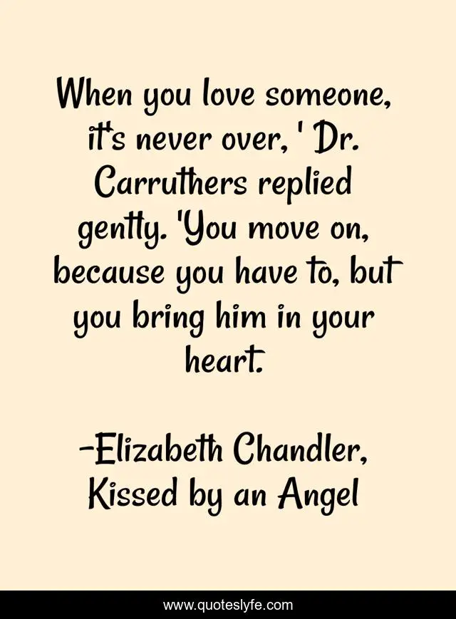 This page presents the quote "When you love someone, it's never over, ' Dr. Carruthers replied gently. 'You move on, because you have to, but you bring him in your heart.". Author of this quote is Elizabeth Chandler, Kissed by an Angel. This quote is about love, bhie, kissed-by-an-angel, elizabeth-chandler, moving-on, affection,.
