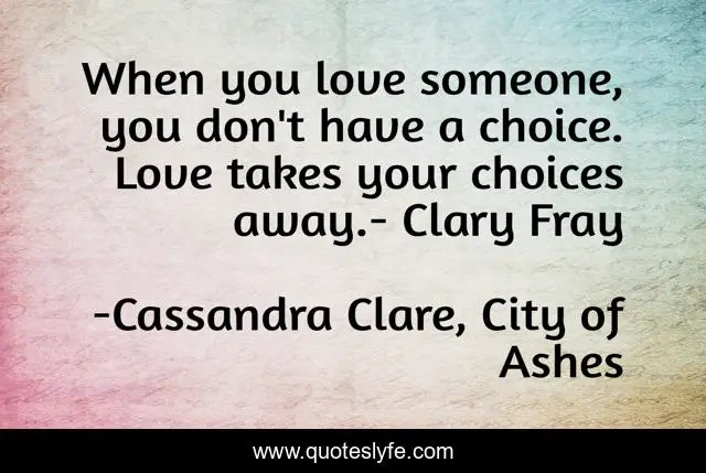 This page presents the quote "When you love someone, you don't have a choice. Love takes your choices away.- Clary Fray". Author of this quote is Cassandra Clare, City of Ashes. This quote is about clary-fray, cassandra-clare, love, mortal-instruments, affection,.