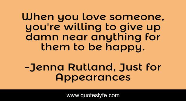 This page presents the quote "When you love someone, you're willing to give up damn near anything for them to be happy.". Author of this quote is Jenna Rutland, Just for Appearances. This quote is about bliss, love, contemporary-romance, affection,.