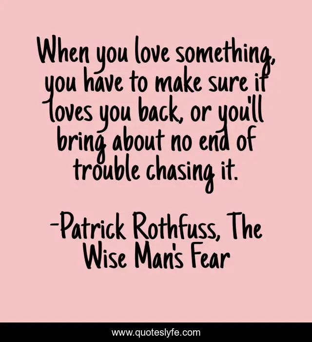 This page presents the quote "When you love something, you have to make sure it loves you back, or you'll bring about no end of trouble chasing it.". Author of this quote is Patrick Rothfuss, The Wise Man's Fear. .