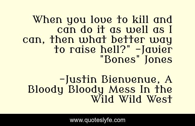 This page presents the quote "When you love to kill and can do it as well as I can, then what better way to raise hell?" -Javier "Bones" Jones". Author of this quote is Justin Bienvenue, A Bloody Bloody Mess In the Wild Wild West. .