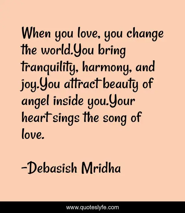 This page presents the quote "When you love, you change the world.You bring tranquility, harmony, and joy.You attract beauty of angel inside you.Your heart sings the song of love.". Author of this quote is Debasish Mridha. This quote is about life, love, knowledge, inspirational, intelligence, philosophy, wisdom, quotes, affection,.