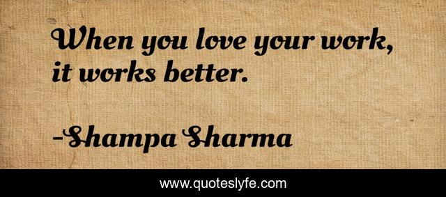 This page presents the quote "When you love your work, it works better.". Author of this quote is Shampa Sharma. This quote is about motivation, love, work, dedication, affection, inspiration,.