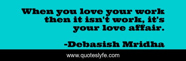 This page presents the quote "When you love your work then it isn't work, it's your love affair.". Author of this quote is Debasish Mridha. This quote is about life, debasish, love, mridha, work, philosophy, affection,.